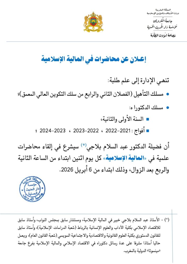 أن فضيلة الدكتور عبد السلام بلاجي(*) سيشرع في إلقاء محاضرات علمية في «الـمالية الإسلامية» كل يوم اثنين ابتداء من الساعة الثانية والربع بعد الزوال، وذلك ابتداء من 6 أبريل 2026.