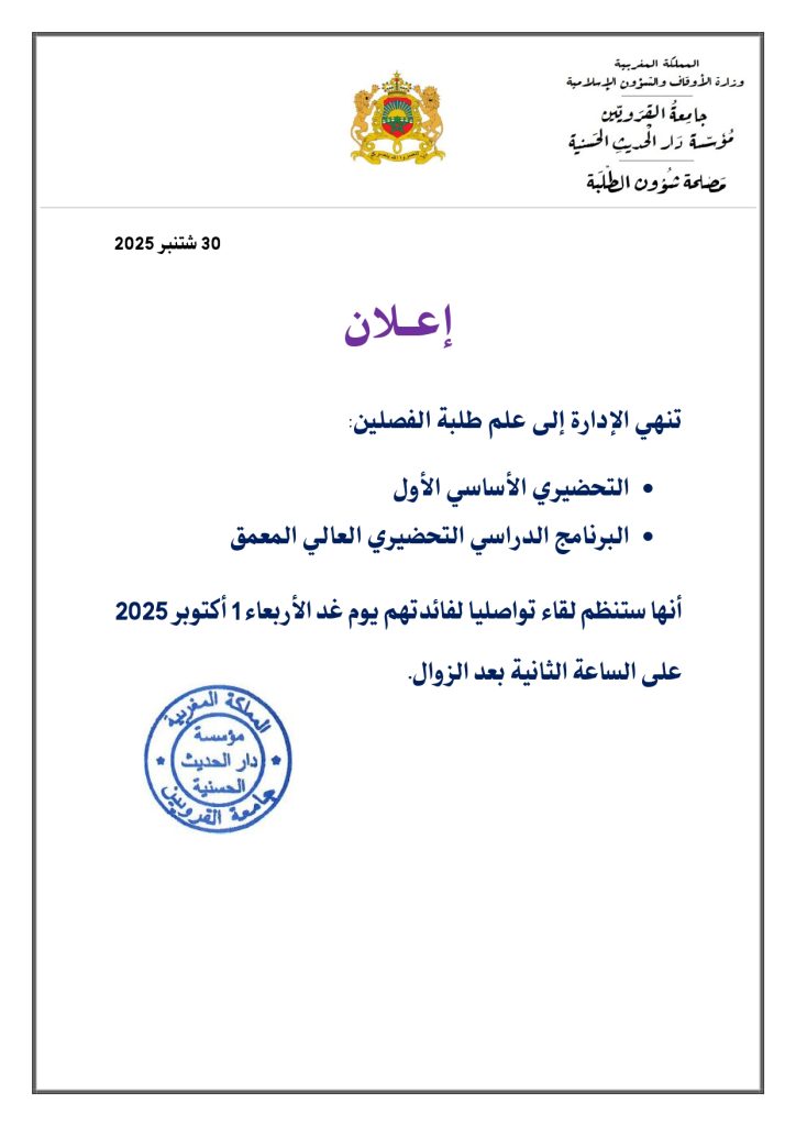 إعلان عن لقاء تواصلي لفائدة طلبة التحضيري الأساسي والأعلى المعمق