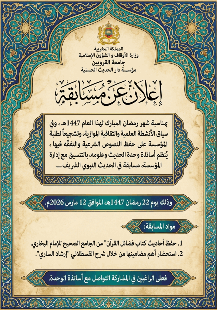 بمناسبة شهر رمضان المبارك لهذا العام 1447هـ، وفي سياق الأنشطة العلمية والثقافية الموازية، وتشجيعاً لطلبة المؤسسة على حفظ النصوص الشرعية والتفقه فيها ، يُنظم أساتذة وحدة الحديث وعلومه، بالتنسيق مع إدارة المؤسسة، مسابقة في الحديث النبوي الشريف