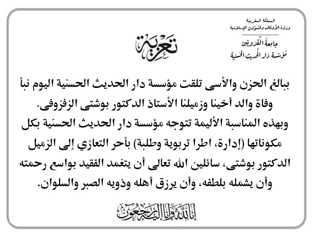 ببالغ الحزن والأسى تلقت مؤسسة دار الحديث الحسنية اليوم نبأ وفاة والد أخينا وزميلنا الأستاذ الدكتور بوشتى الزفزوفي.